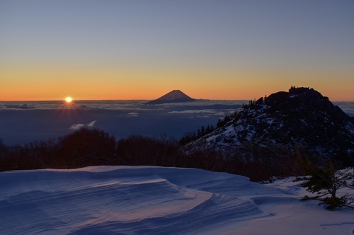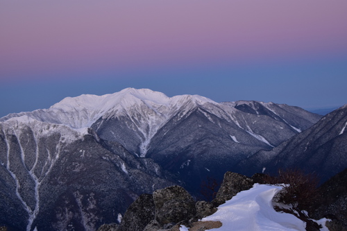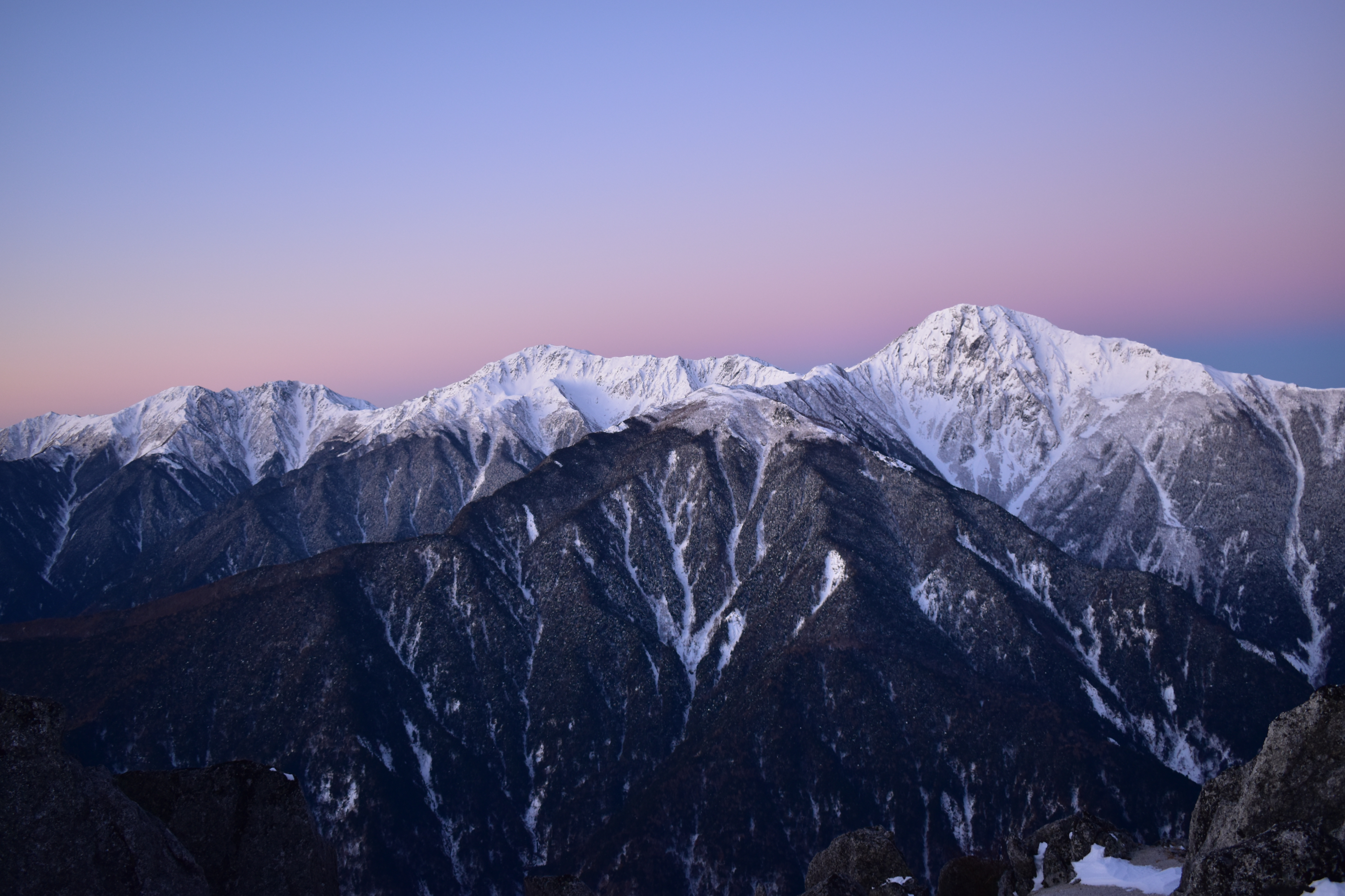 朝日が昇る前の白峰三山です。グラデーションがとても美しいです。ここ数年、鳳凰三山で初日の出を拝み、白峰三山を見ていますが、雪を被った白峰三山は雄大でいつ見ても圧倒されます。