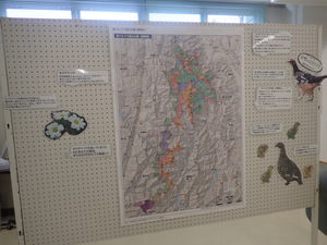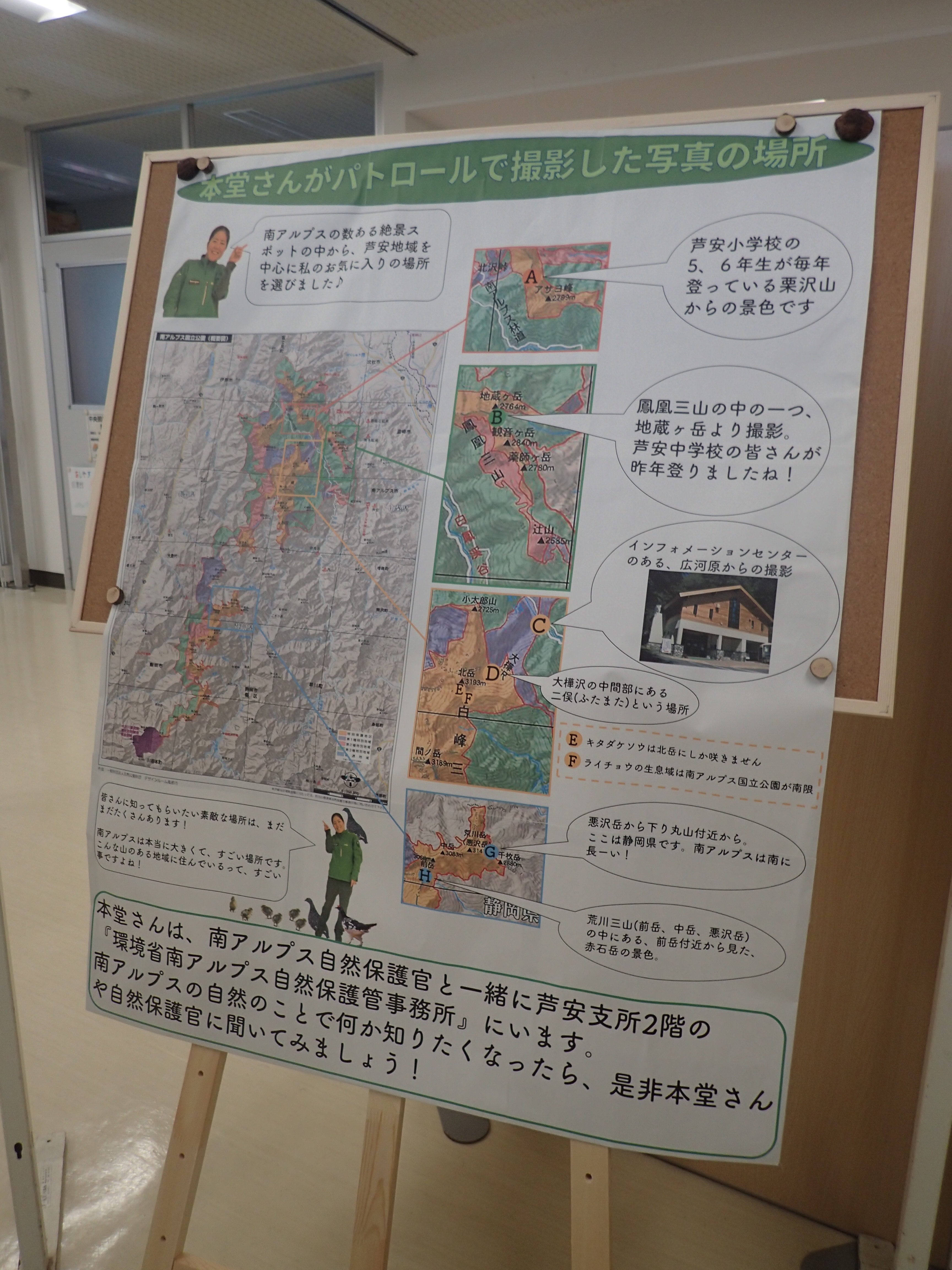 また、地域おこし協力隊の方がライチョウ、キタダケソウの紹介や国立公園概要図を用いた、写真の撮影場所情報や南アルプス国立公園の特徴を小さくなったわたしの写真付き解説ポスターを展示しています。