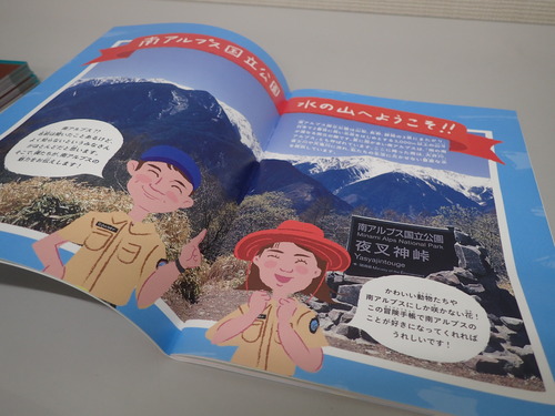 配布しているパンフレットの中に『冒険手帳』というオレンジ色の冊子があります。南アルプス国立公園の豊かな自然や特徴をイラストでわかりやすく説明している冊子です。