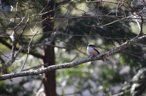 尾が長いことからエナガという名前です。見たまんまですね。エナガはコケを集めて木の枝に球形の巣を作ります。目のラインが黒く、頭は頭頂部分だけきれいに剃った武士のように見えるのが特徴で、北海道~九州の平地、低山の林に生息しています。この1羽の周りに複数羽いて、日が当たる枝に止まって、みんなで日向ぼっこしているようでした。