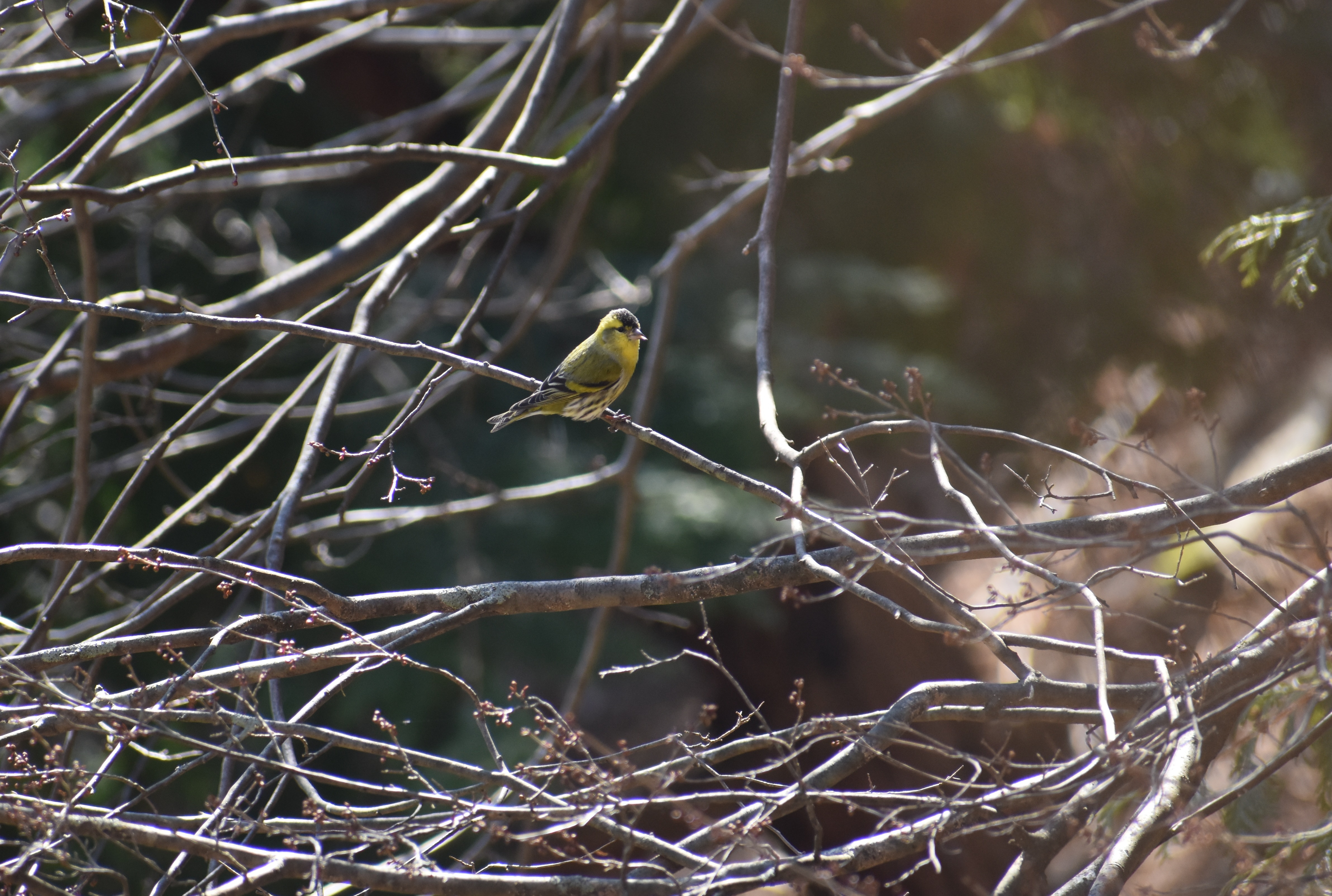 オスは頭が黒色で顔から腹にかけて黄色メスは緑灰色、オスは、メスは白っぽい色をしています。普段は本州中部以北に生息しています。この周辺へは冬鳥として渡来し、カバノキなどの種子を食べています。野生の鳥でこのような色をした鳥をみたことがなかったので、初めてマヒワを見たときは衝撃を受けました。
