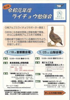 今回の勉強会では、東邦大学訪問研究員の小林さんと東京都恩賜上野動物園の高橋さんに講演いただきました。小林さんは北岳でケージ保護を行っていたこともあり、大変お世話になっています。小林さんからは急激に減少した白峰三山のライチョウが回復傾向になった大きな理由は、ケージ保護と捕食者対策の両立であり、白峰三山で行ったケージ保護や捕食者対策を平成30年11月に個体が確認された中央アルプスでも参考にし、定着させていきたいとのことでした。今後の取り組みによって中央アルプスでもライチョウが見られるかもしれません!高橋さんからは動物園でライチョウを飼育するまでのエピソードや飼育方法、また上野動物園での飼育のようすについてお話いただきました。貴重なお話を聞くことができ、とても充実した時間でした♪