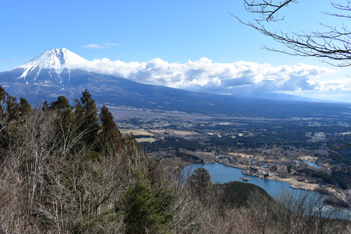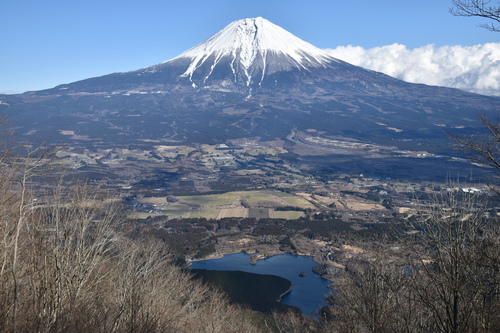 ▲登山道途中の休憩スペースから撮影した富士山と田貫湖(手前の湖)