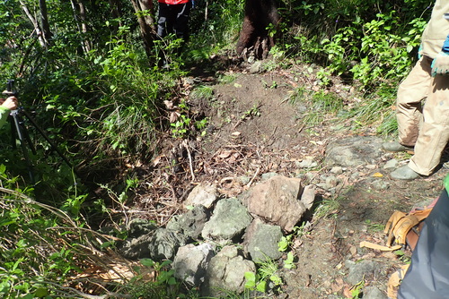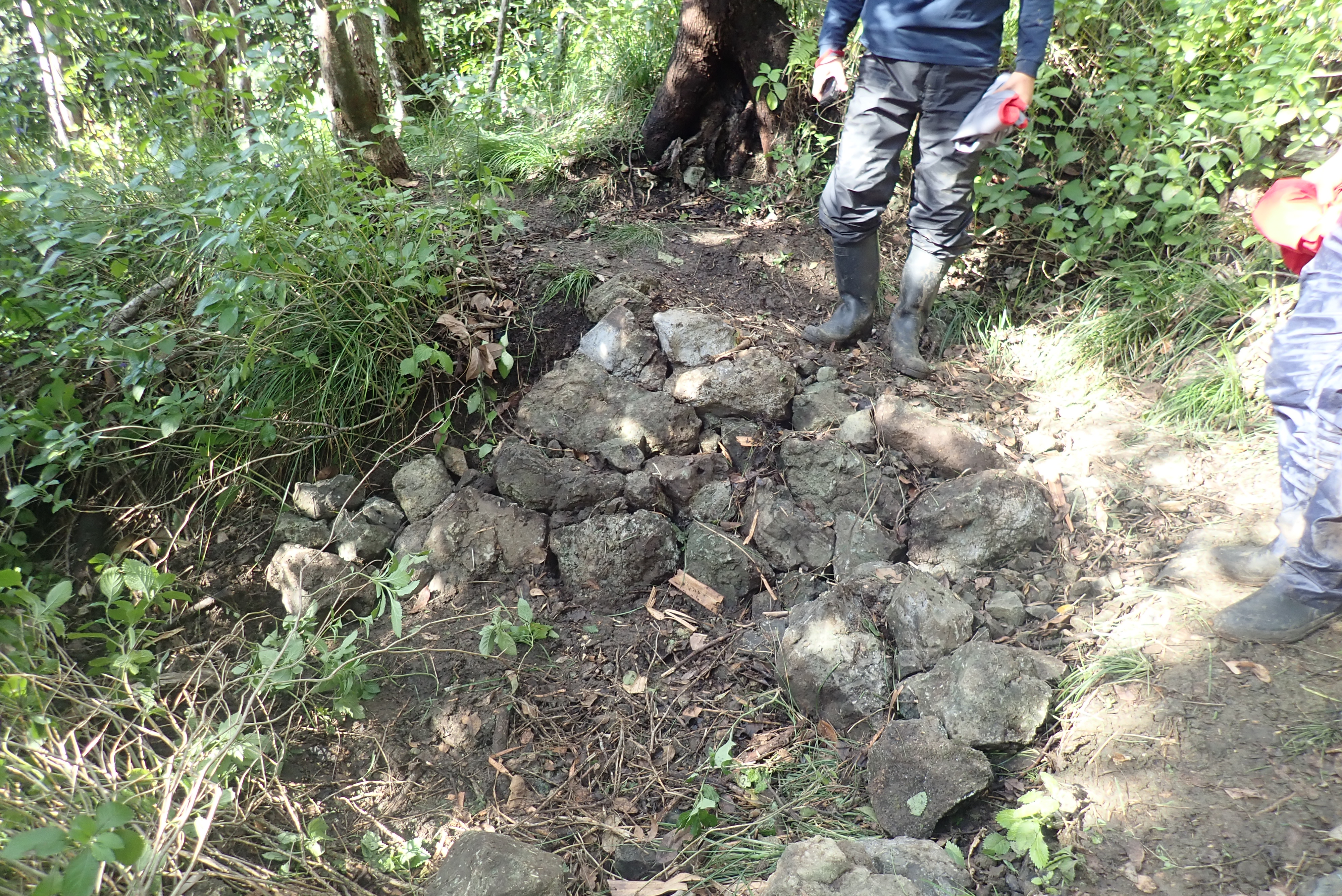 つまり滑りにくい工夫をしながら、外来樹のモクマオウ、石を利用して整備を行いました。