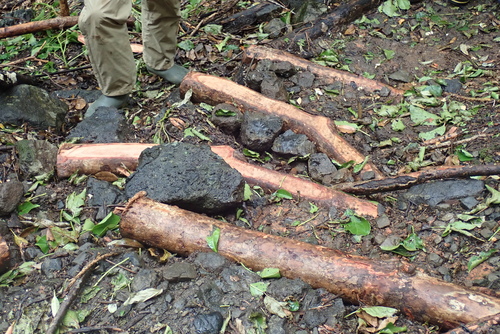 (ちなみに、木材は事前に別の場所にて、適したサイズの外来樹を見つけて切り倒し用意します 。石材は整備周辺箇所のものを活用します。)