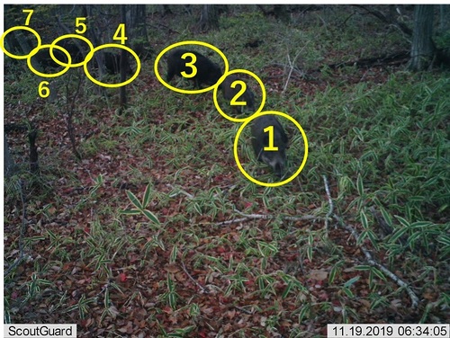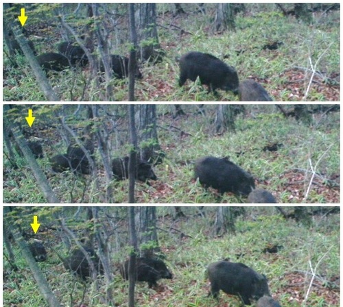 ▲7頭目のイノシシもコマ送りすることで見つけられる