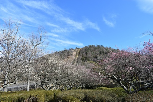 歩いて登る場合は、歩道の途中に恐竜の遊具がある恐竜広場と、言葉通り展望がすばらしい展望広場を通りながら山頂まで30分程度で登ることが出来ます。展望広場はとても広く遊具のほかにも休憩スペースやベンチなどもありますので、お弁当を持参して訪れるのもおすすめです。巡視の際は見ごろを終えた早咲きの桜の花びらが風に舞っていました。この桜は1月の下旬頃咲き始めるので、新年早々、広場でお花見も楽しめそうです。
