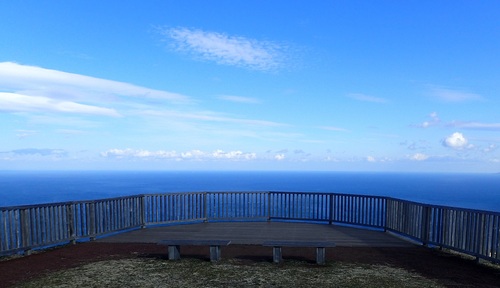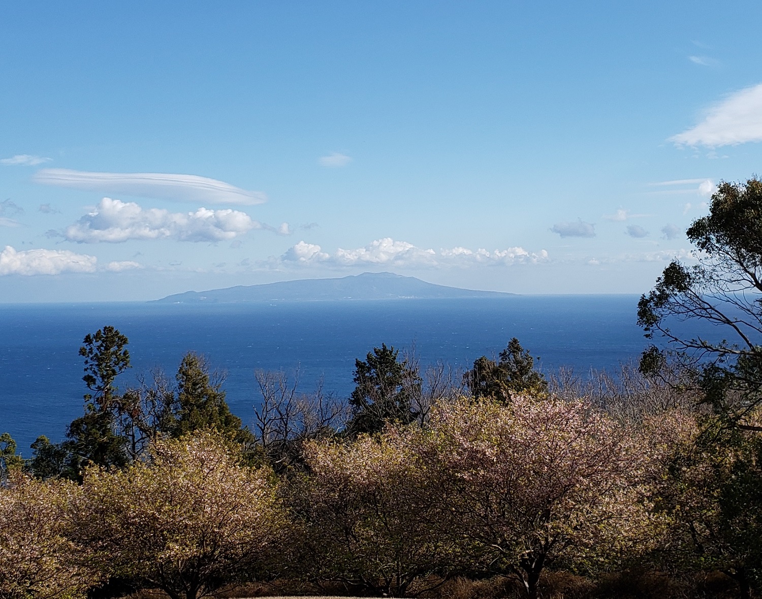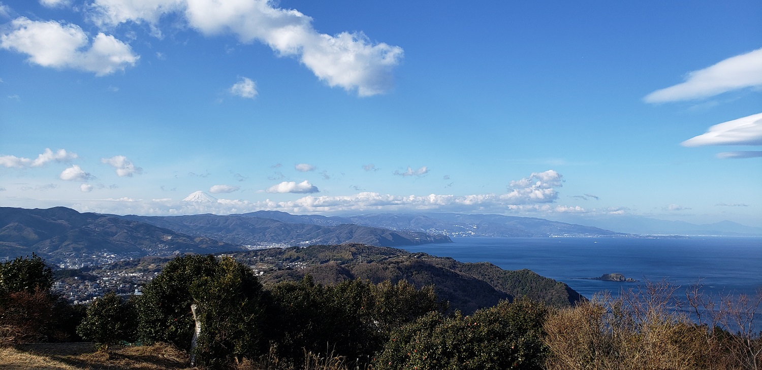 展望広場の眼下には相模灘が広がり、正面には伊豆大島、南西には三宅島をはじめとした伊豆七島を望むことが出来ます。真っ青な海に浮かぶ伊豆の島々を前に、つい時間を忘れてカメラのシャッターを切ってしまいました。