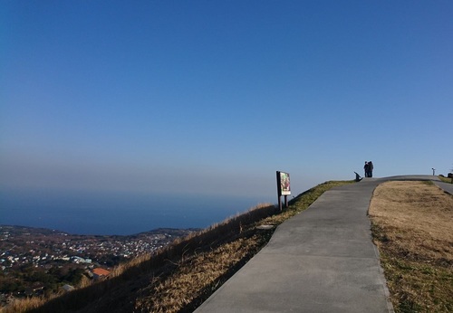山頂の噴火口を周回する約1㎞30分程の遊歩道は、周りに遮る物もなく、まるで空に続く道のようです。遊歩道からは、火山が作った伊東の大地、真っ青な相模灘、伊豆七島、房総半島、そして富士山と360°の大パノラマを楽しめます。大室山山頂は"富士山がある風景100選"に選定された場所の一つにもなっています。