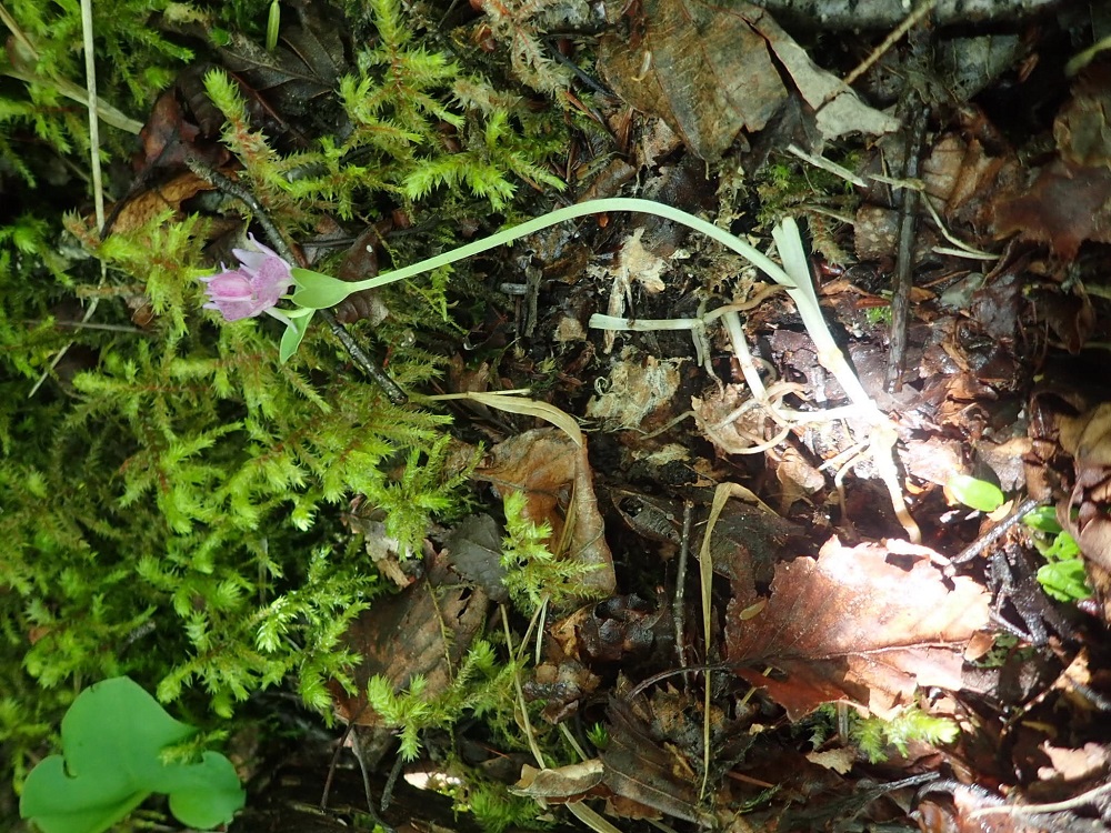 カモメランは深山の森の中に生育しています。条件が良いと咲き、まれに群落を作ります。茎は細く、短いため、よく目をこらさないと見つけられません。
