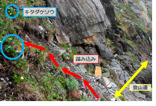 踏み込まれた部分は植物がなくなり、土が流れ出しています。また、踏み込みのいちばん上では、土が流れ出したために、キタダケソウの株ごと土壌が落下してしまう恐れがあります。乗り越えたい気持ちをぐっと抑えて登山道から外れずに愛でていただけると幸いです。