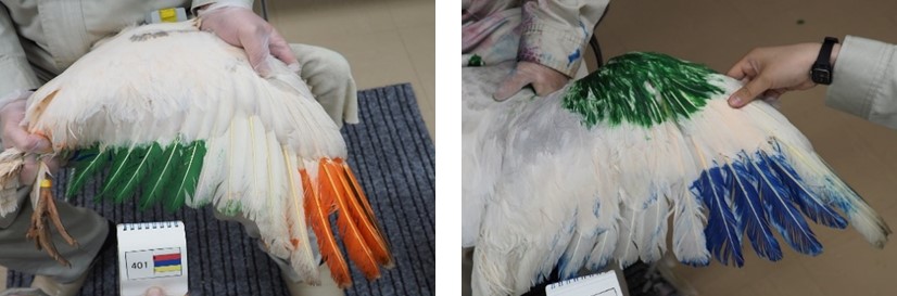 マーカーは基本的に片方の羽につき2か所塗っており、個体ごとに色の組み合わせが決まっています。