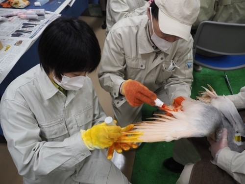 ▲目隠しでおとなしくなったトキにマーカーで着色する様子。1羽につき2人で色を塗っていきます。