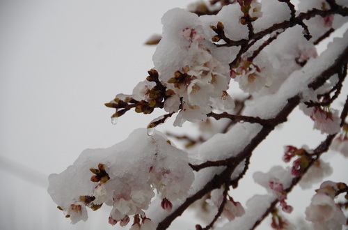 今朝は窓を開けたら雪が積もっていてびっくりしました。富士五湖エリアでも桜が咲き始めていますが、花たちが雪をかぶって重そうにしていました。