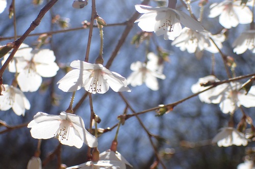 4月、箱根や富士周辺に自生する桜、「マメザクラ」が咲き始めました。花の付き方が独特で、1輪ずつのかわいらしい花が枝に下向きで付いています。下から見上げると、桜花1輪1輪が、すべてこちらを向いてくれます。また、遠目に見ると、霧のような、粉雪のような、周囲に溶け込む美しい桜です。