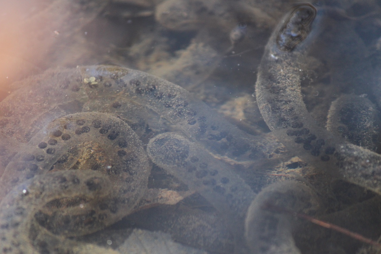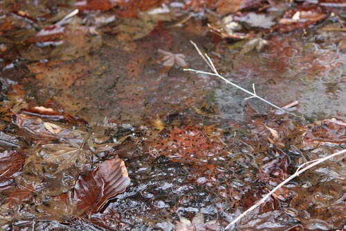 カエルといえば、春まで冬眠するのが一般的ですが、ヤマアカガエルはこの寒い時期に一度目を覚まし、ほかのどのカエルたちより早く産卵を行います。今年の3月にはオタマジャクシがこの池に大発生し、びっくりするような状態でした。そんな池で、4月3日、たまたま近くを通ると、たくさんのカエルの声がするではありませんか。