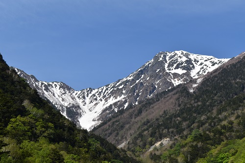 大樺沢に雪が残っているものの、全体的に白さは少なく下部は鮮やかな新緑が見えます。開山までにどのくらい雪が溶けるのか、楽しみですね。