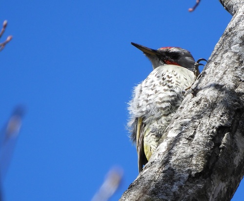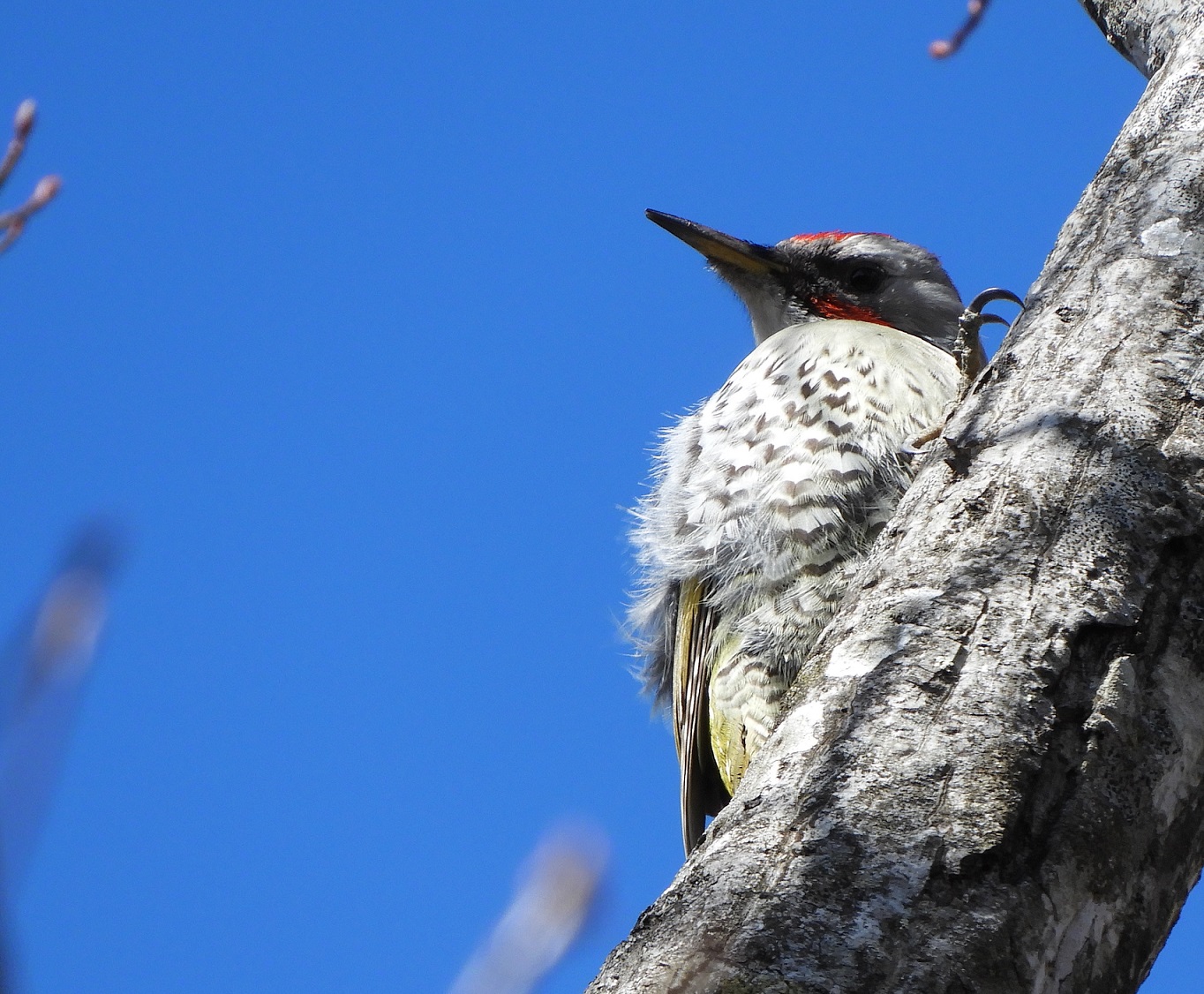 下から見ると白い幹と同化して、でかいこぶがあるように見えましたが、このいかにもふわふわそうな羽毛・・・奥多摩で良くみかけるキツツキ目のアオゲラでした。