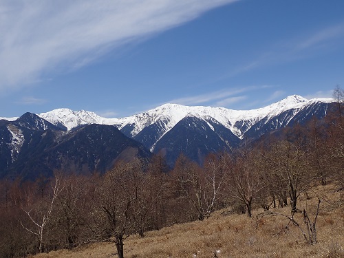 右から北岳(3,193m)、間ノ岳(3,190m)、農鳥岳(3,026m)です。最近の山梨は晴れが多いですが、南アルプスの山々は白く覆われていることが多々あります。覆われているときに雪が降っているのか、白峰三山は真っ白です。夜叉神峠にはライブカメラが設置されており、いつでも白峰三山のようすを見ることができます。登山者が写っていたり、朝焼けしていたり、夜には星空が見えることも!お家の中でも南アルプスを楽しんでください♪