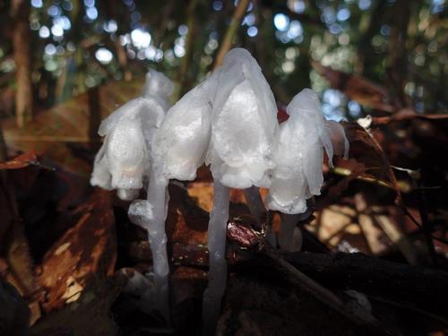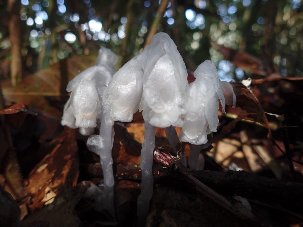 腐生植物といって、葉緑素を持たずに菌類と共生することで栄養をもらう為、暗い森でも成長できるという、白く輝いて見えるツツジ科植物です。