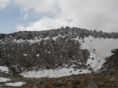 4月16日、その茶臼岳に巡視に行ってきました。ロープウェイ山頂駅から少し登るとあっという間に山頂、そしてお鉢。緩やかな山麓の様相とは打ってって変わって、ゴツゴツ、ガラガラの岩、そこに絡む雪。「こんなに簡単にこの景観に出会えるのか」と驚きました。