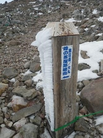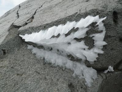 ここで風の強さを物語るものものを見つけました。山頂付近の岩には所々に着氷が見られます。その形は不思議というか芸術的。あるものは何かのエンブレムに採用されそうです。