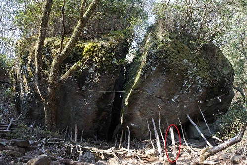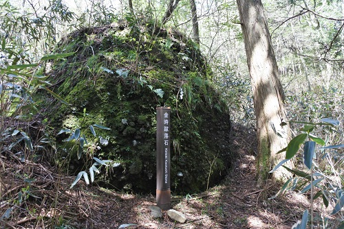 その神社を通り過ぎ登山道を進むと、途中で少し道から逸れたところに大岩があります。