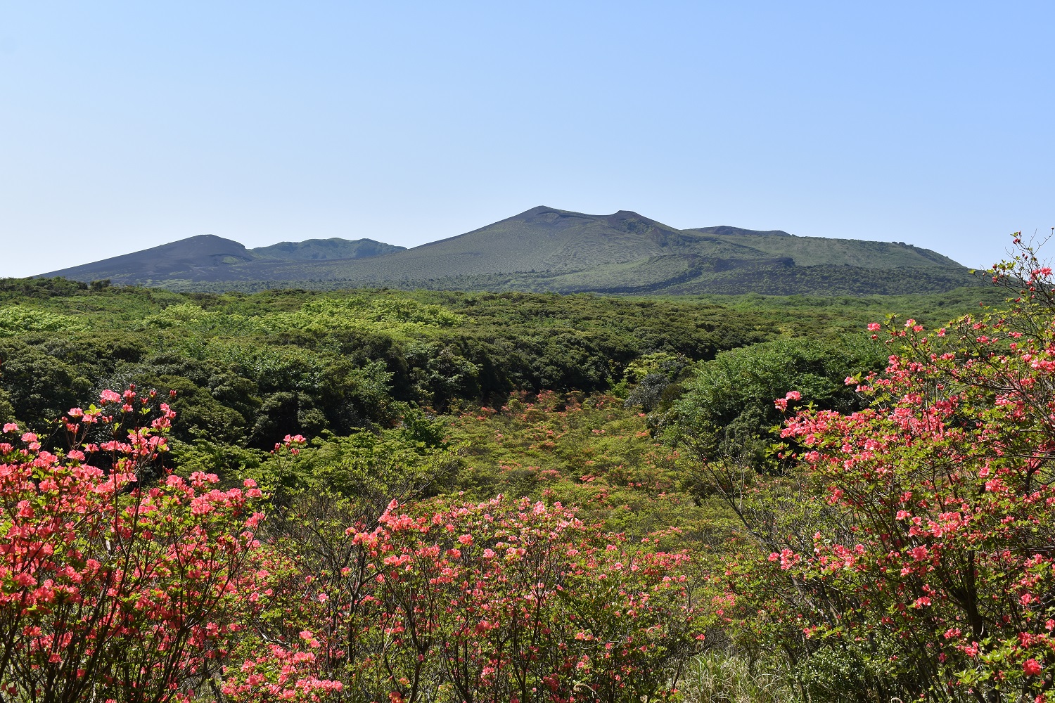 ▲オオシマツツジと三原山(大島温泉ホテル付近つつじ園)