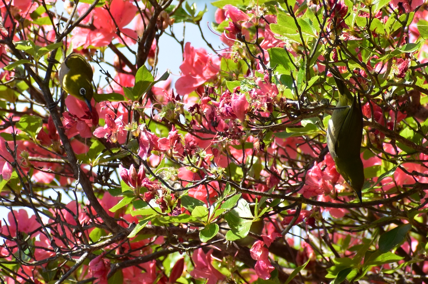 大きなツツジの下をゆっくり歩いていると、シチトウメジロの群れに出会いました。