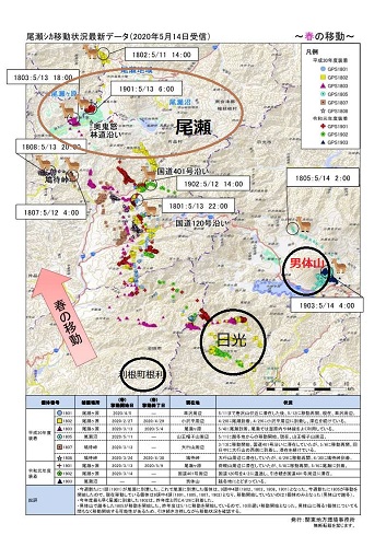 尾瀬では、シカにGPSを付けて調査をしていますが、今年は3月中旬頃に日光から移動を開始し、現在は調査中のほとんどのシカが尾瀬方面に向かっています。