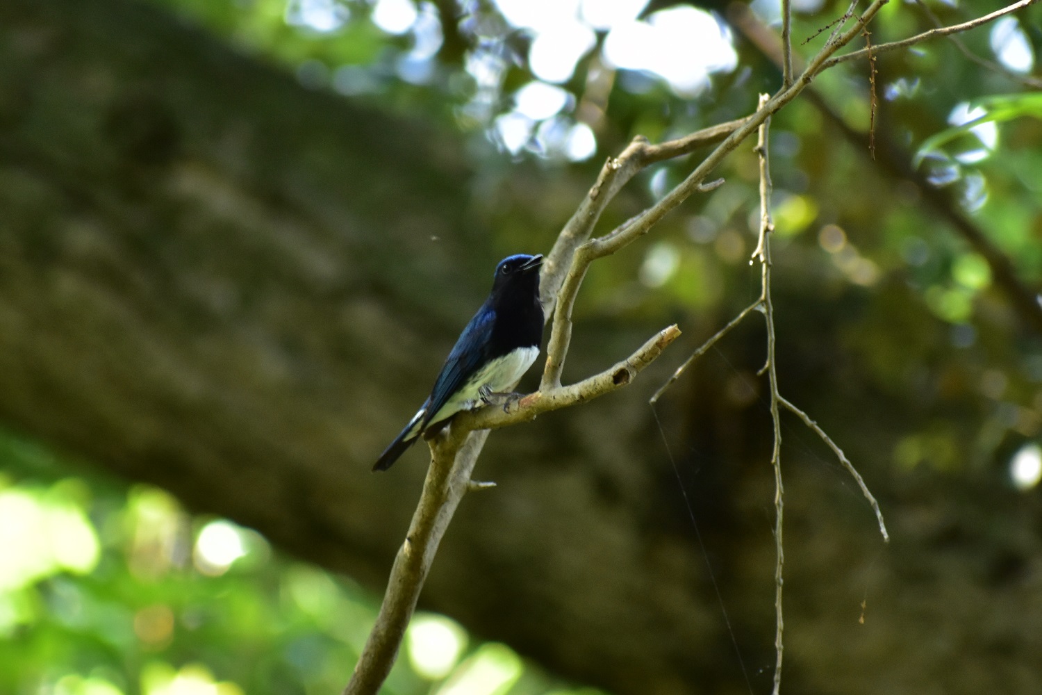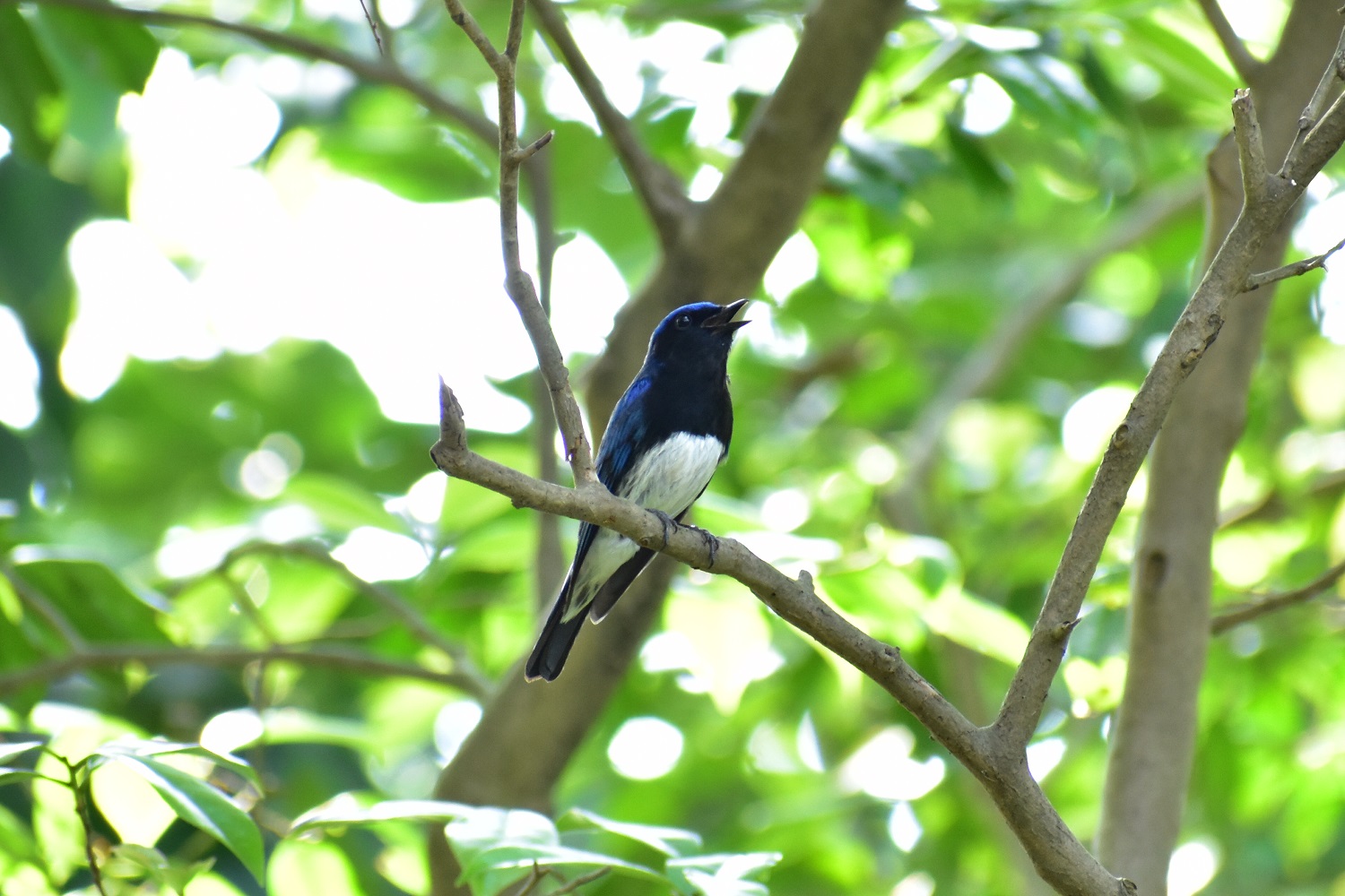 夏の間にオオルリを写真に撮りたいと思い、さえずりを聞く度にカメラを構えて姿を探していましたが、なかなか見つけることができずにいました。すぐ近くからさえずりが聞こえているのに、瑠璃色と白色の体が薄暗い林の中に意外と上手く溶け込んで、どうしても姿が見えないのです。