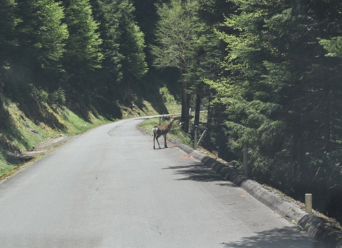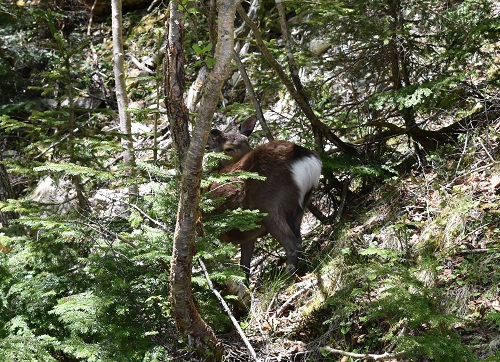 多くの方がなんの動物なのかお分かりかと思いますが、ニホンジカです。今年は積雪量が少なく、林道バスが運休していて人の出入りがないことから、ニホンジカにとっては楽園のような状態になっています。ニホンジカ対策に取り組んでいる関係機関のデータによると、6月上旬くらいに仙丈ヶ岳の標高2,500m地点のあたりまで登っている個体がいるようです。6月下旬に仙丈ヶ岳の防鹿柵の立上げ作業を行いますが、高山植物が食害に遭っていないことを心から祈ります。