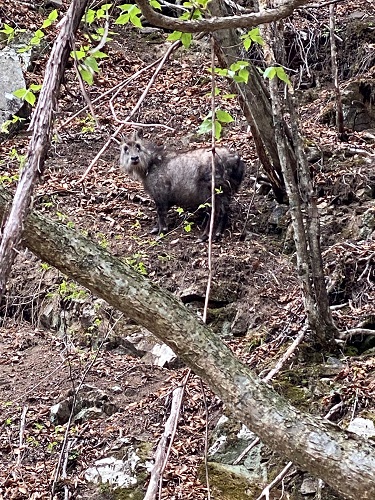 カモシカを見たのは初めてですが、ニホンジカと比べ丸々としている印象でした。毛の色合いも相まって、一瞬イノシシかと思ったほどです。