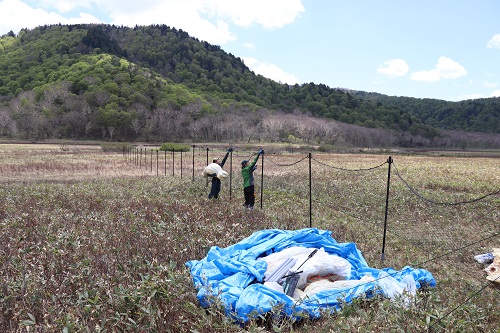 尾瀬国立公園では環境省の事業として植生保護柵を設置しています。設置作業は業者に委託していますが、先日お手伝いとして作業に参加してきました。支柱やネットなどの資材はかなり重く、肩にアザができていました・・・。シカの食害から湿原植生を保護するためには大変な労力と時間が必要であることを痛感しました。(小林)