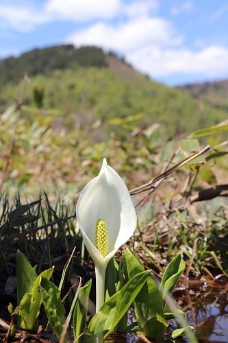 下ノ大堀のシカ柵設置に行く途中に撮影しました。山ノ鼻エリアにある研究見本園ではミズバショウが可愛らしく咲いていました。「研究見本園」と作られた植物園のような名前ですが、自然に自生していて人工的なものではありません。(尾池)