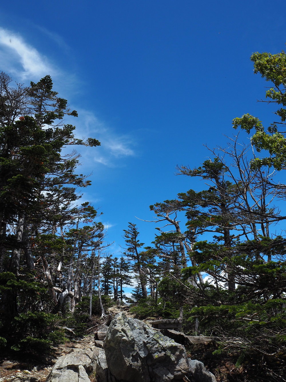 山頂付近は岩がごろごろしていて、空を見上げるとまっすぐ伸びる木が空に映える!!