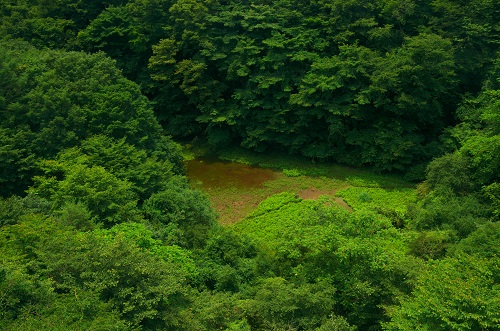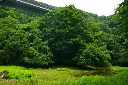 樹々の中にひっそりと現れた幻の池(上に見えているのが瀬々波橋です)(7月21日撮影)