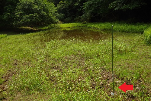 7月16日には棒(赤矢印)付近まで水があったそうです(7月21日撮影)