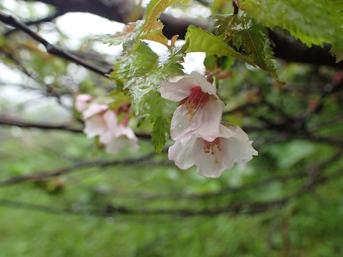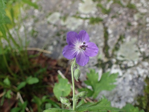 写真の通り、今回の行程では青空は一度も出ることはなく、雨が降りずっとガスで真っ白でした。足元や目先を見てみると、ミネザクラが咲いていたり、初夏を漂わせるタカネグンナイフウロが咲いていました。