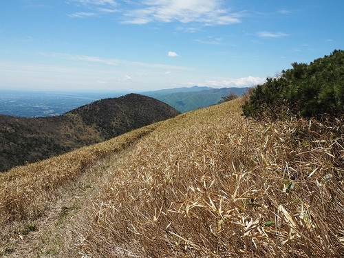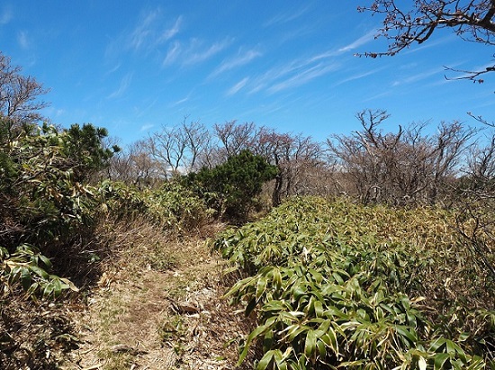 頂上が近くなると坂は緩やかになるとともに、植生が変わります。樹木はなくなり、笹原となります。