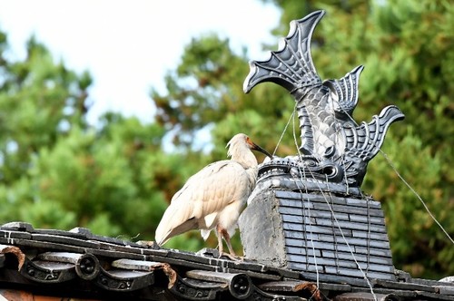 なんと、この幼鳥は神社の屋根にとまっているのです!