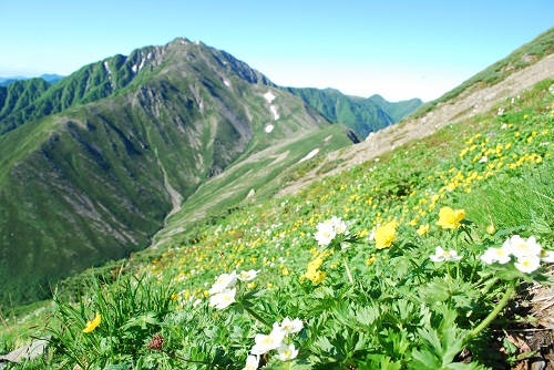 南アルプス国立公園の魅力の1つとして、種類・色彩が豊富な高山植物が挙げられます。中でも、アイコンに使われている荒川岳のお花畑は、南アルプスの中でも1番大きいといわれています。登山道沿いにあるこのお花畑、下アングルから見てみると・・・。