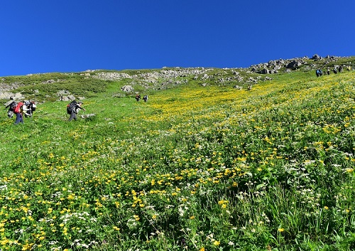 黄色、白、ピンクなどカラフルな色合いはまさに百花爛漫。この光景を初めて見たときは言葉が出ず、圧倒されました。 重いザックを背負って長時間歩いていたことさえも忘れてしまうくらいでした。今までの疲れが吹き飛びますね。