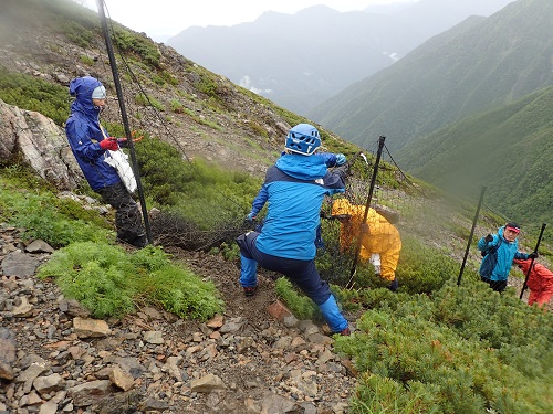 この素晴らしいお花畑を守るために、南アルプス自然保護官事務所では防鹿柵を設置しています。