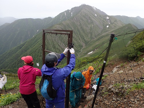 登山道を含むお花畑なので、ニホンジカが侵入しないように入口と出口には扉を設置しています。(写真右)多くの方の協力があって、美しい状態を保てています。関東地方環境事務所のアクティブ・レンジャー日記のアイコンを見た際には、斜面いっぱいに広がる素敵なお花畑、そしてお花畑を守るための取り組みを思い出していただければと思います。