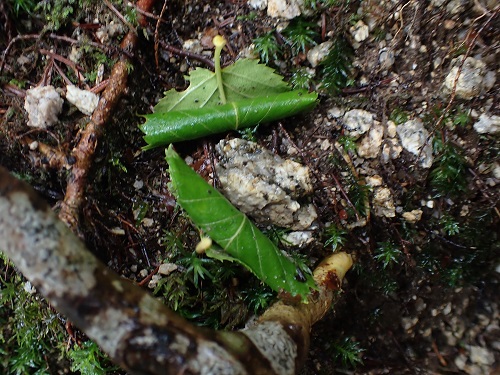 オトシブミが作った揺籃(ようらん)と呼ばれるものです。オトシブミとは木の葉を巻いてゆりかごをつくる性質をもったゾウムシの総称です。卵から孵った幼虫は、この揺籃を食べ、成虫になるまでこの中で暮らします。葉の巻物が「文(ふみ)」に似ていることから、揺籃を作る昆虫をオトシブミと呼ぶようになったそうです。登山道のあちこちに落ちていていました。孵化する前に踏まれてしまわれないよう、無事に孵化してもらいたいです。