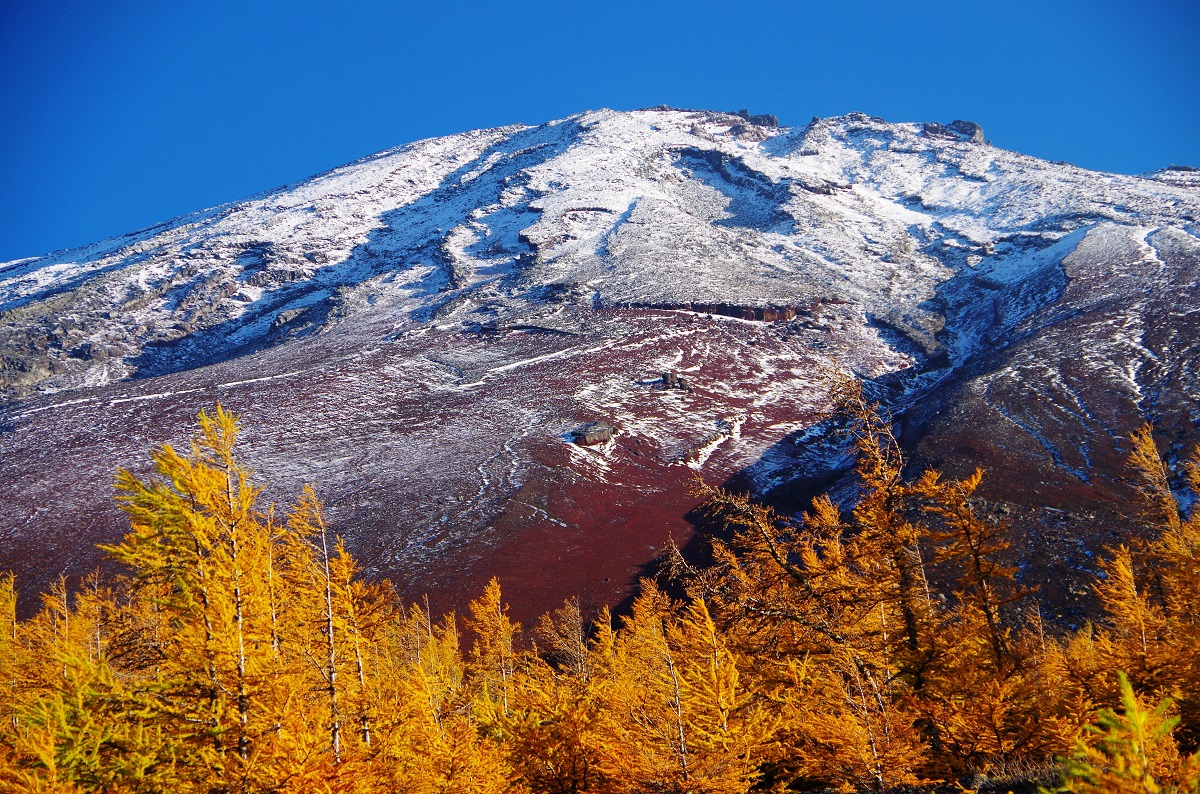 初冠雪の富士山と黄金色に染まったカラマツ(2017年10月26日撮影)
