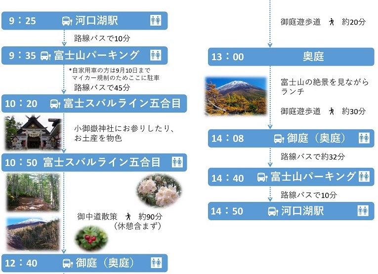 もう少し歩きたいという方は、モデルコース①のアレンジで、三合目のバス停で下り、精進口登山道をスバルライン五合目まで歩く(約120分)コースをプラスし、17:08のバスで下山というのもおすすめです。
