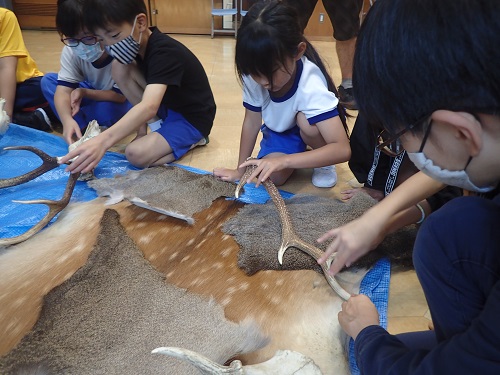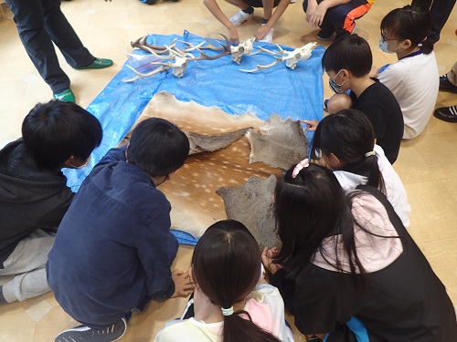 ニホンジカの姿はよく見かけても、毛皮や角に触れたり、ニオイを感じる機会は多くないので、貴重な体験になったのではないでしょうか。また、児童のみならず、初めて触る先生方も多かったようです。