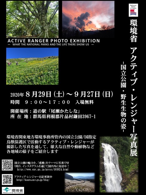 尾瀬国立公園片品地区では、令和2年8月29日(土)から9月27日(日)まで「道の駅尾瀬かたしな」(片品村役場隣)でアクティブレンジャー写真展-国立公園・野生生物の姿-」を開催します。